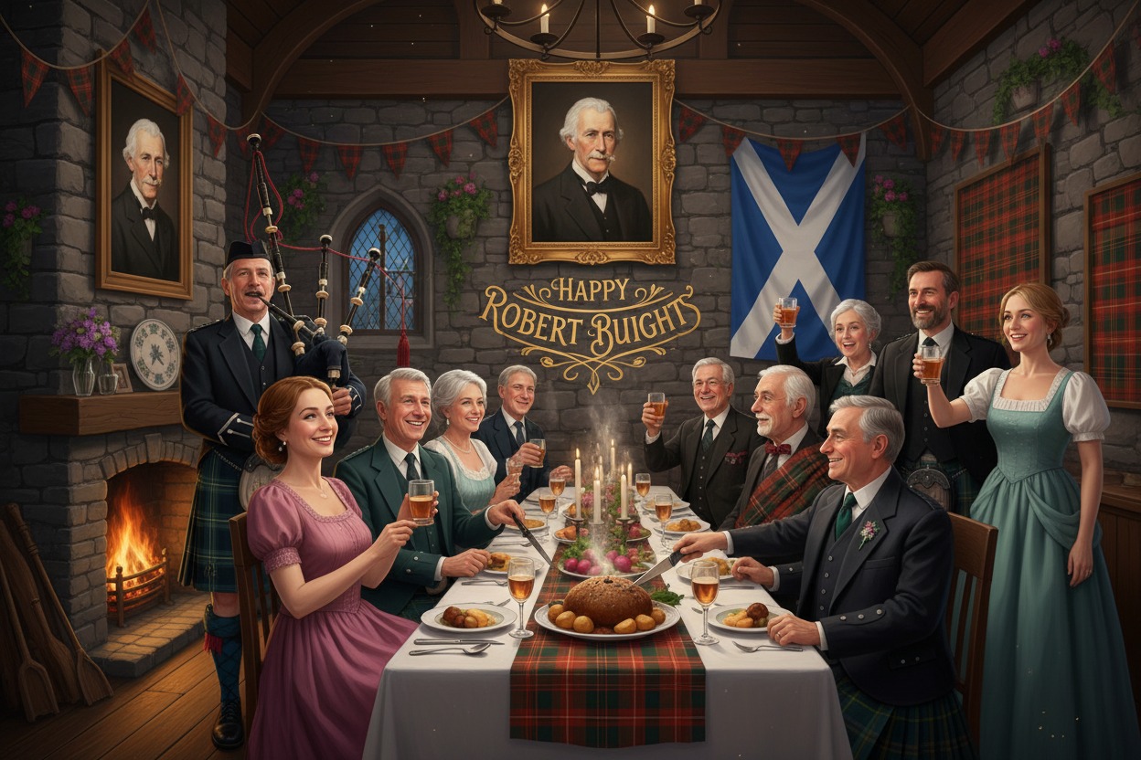 Celebrated in Scotland to honour the poet Robert Burns on his birthday. People have large gatherings and all are happy and merry with music, dancing and refreshments. Why not try writing a poem of your own for your mates- or about your mates!