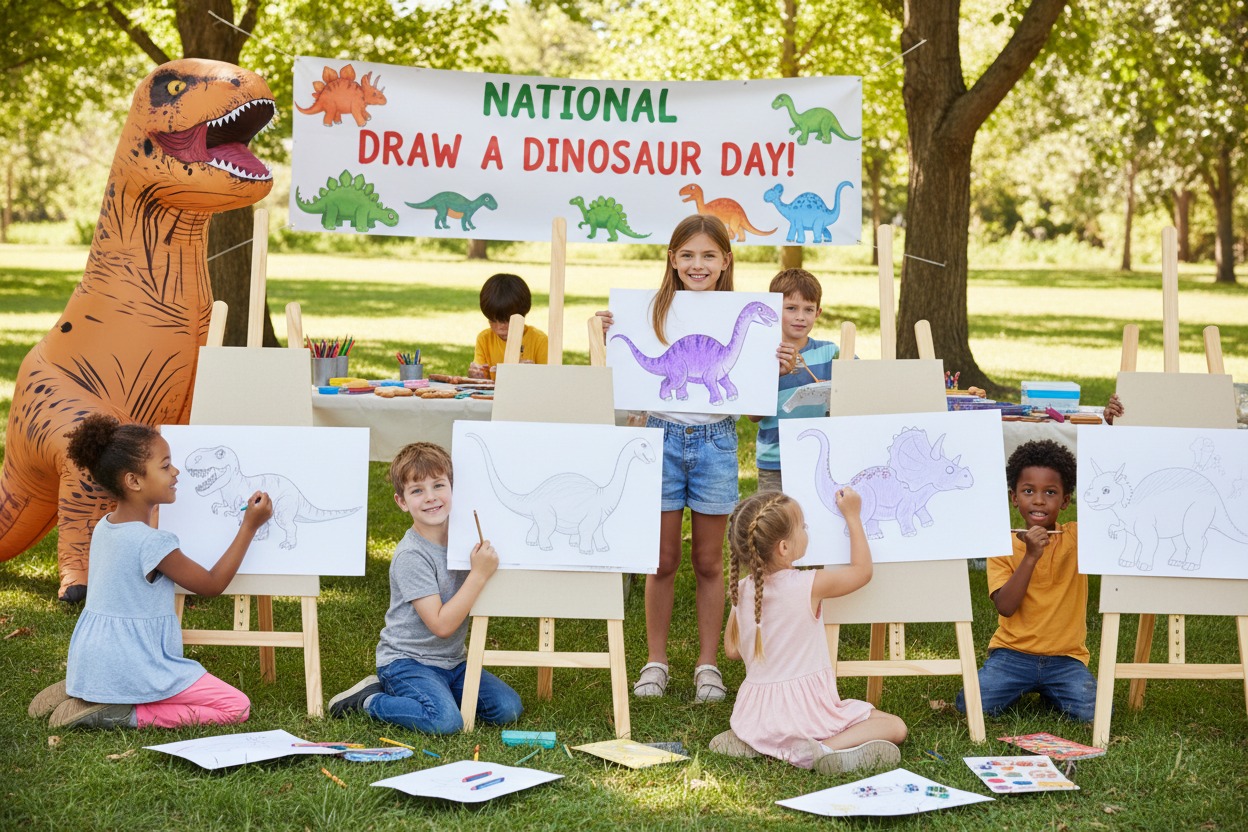Exactly what it says in purple. (usually people would say in black and white) Draw whichever dinosaur you want! This National day was created in 2007 when a bored student was doodling dinos, realised how good he was at art and encouraged his classmates to do the same and draw a dinosaur and the rest as they say is history!